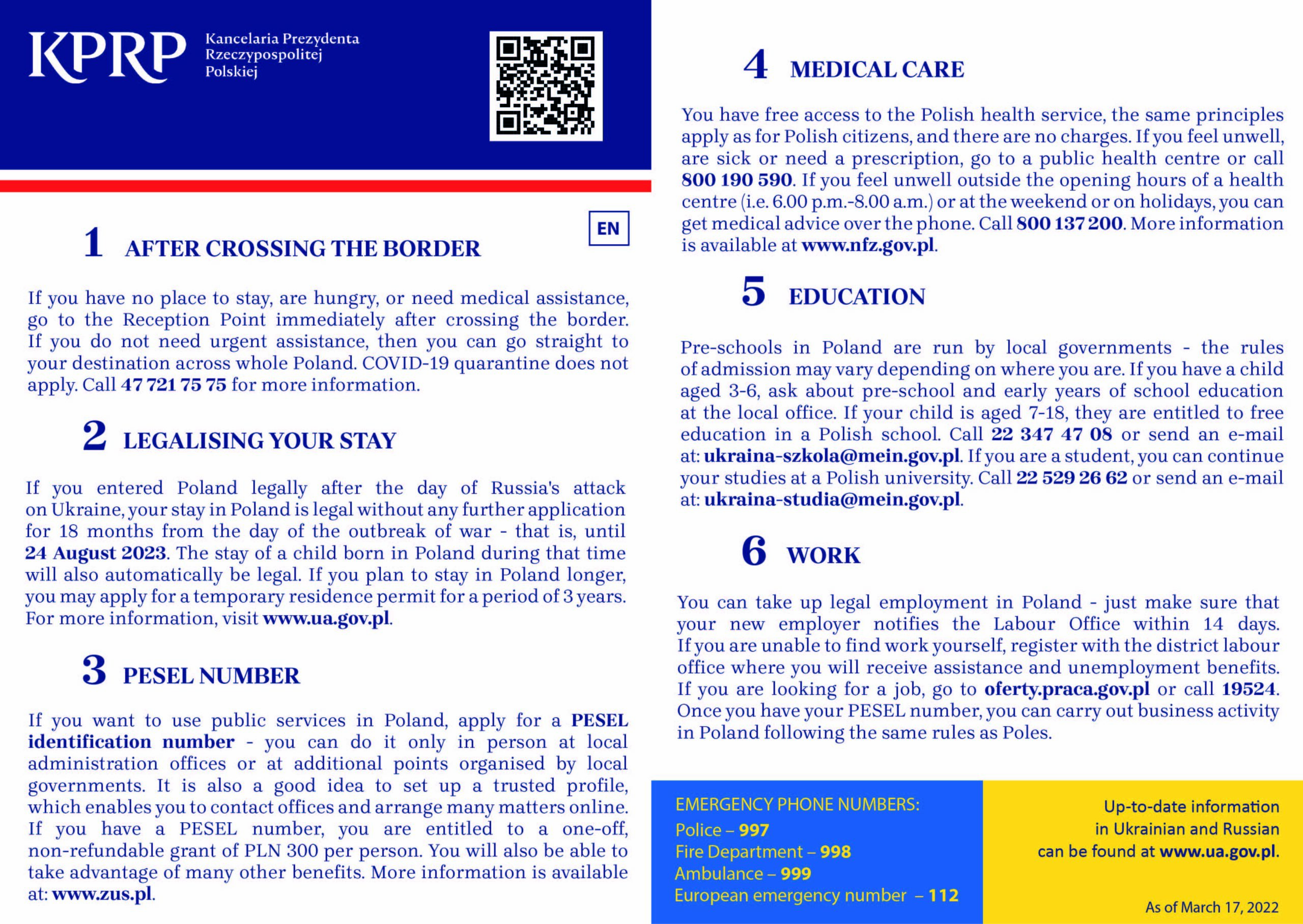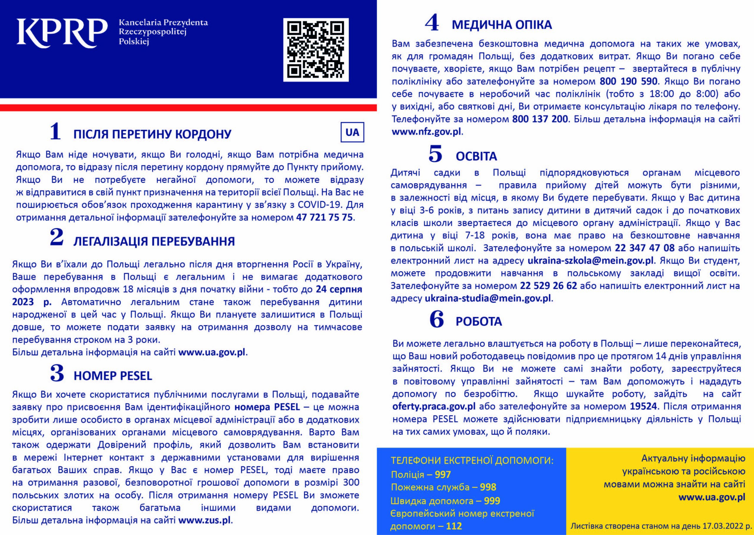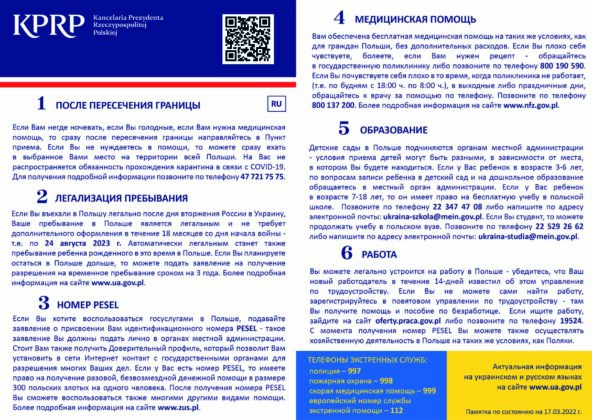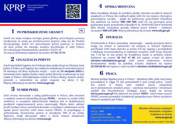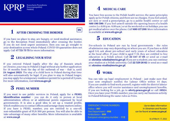 W ulotce znajdują się podstawowe wiadomości o punktach recepcyjnych, legalizacji pobytu i numerze PESEL, opiece medycznej, a także o możliwości edukacji i poszukiwania pracy, wraz z telefonami i adresami internetowymi, pod którymi można uzyskać więcej informacji.