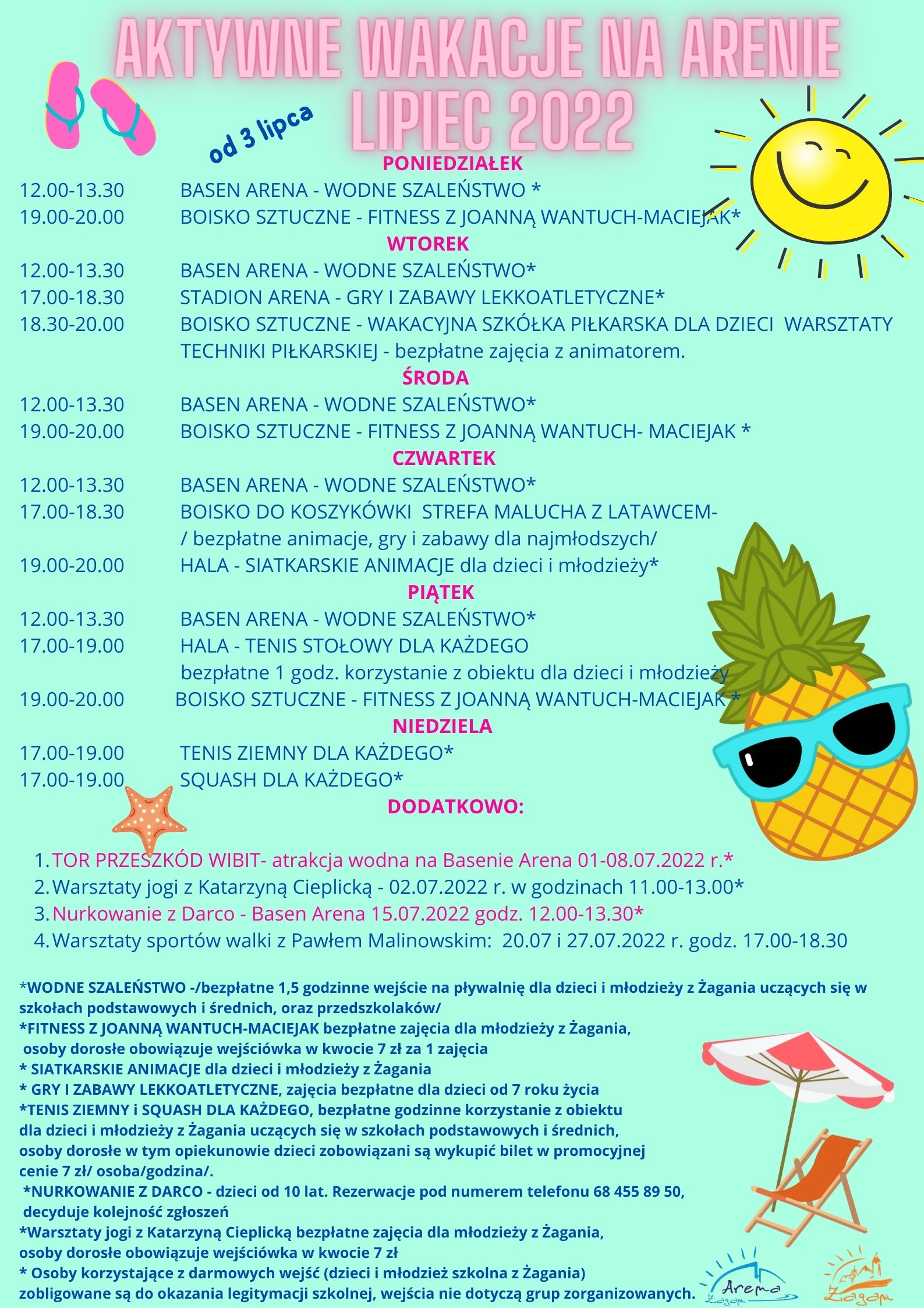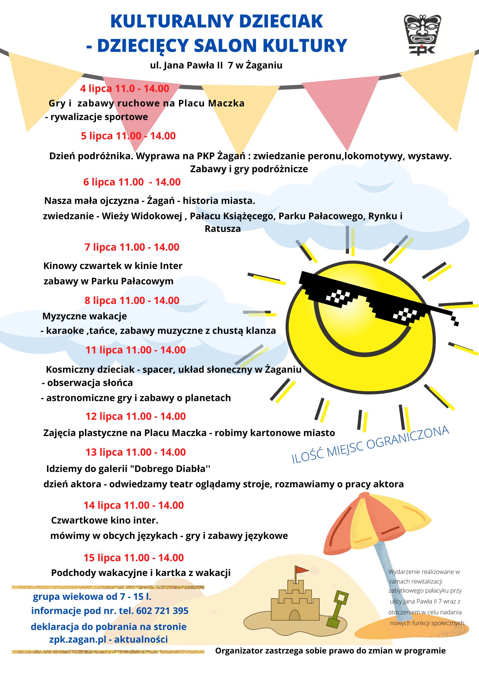 Trwają wakacje z Maszkaronem. Od piątku dostępne jest kąpielisko na Gryżycach oraz “wodne szaleństwo”, czyli bezpłatne wejście na pływalnię Arena dla dzieci i młodzieży z Żagania (przedszkolaków, uczniów szkół podstawowych i średnich). Oferta ta jest dostępna od poniedziałku do piątku w godzinach od 12.00 do 13.30. W lipcu rusza również Dziecięcy Salon Kultury w pałacyku przy ulicy Jana Pawła II 7 oraz sportowa oferta Areny. W połowie miesiąca rozpoczną się również zajęcia dla najmłodszych w Miejskiej Bibliotece Publicznej im. Papuszy. Książnica szykuje dla nas drugi już Festiwal Literacki, który w tym roku zaplanowano na 23 lipca. Na warsztaty archeo dla dzieci oraz bezpłatne zwiedzanie niezmiennie zaprasza Muzeum Obozów Jenieckich.