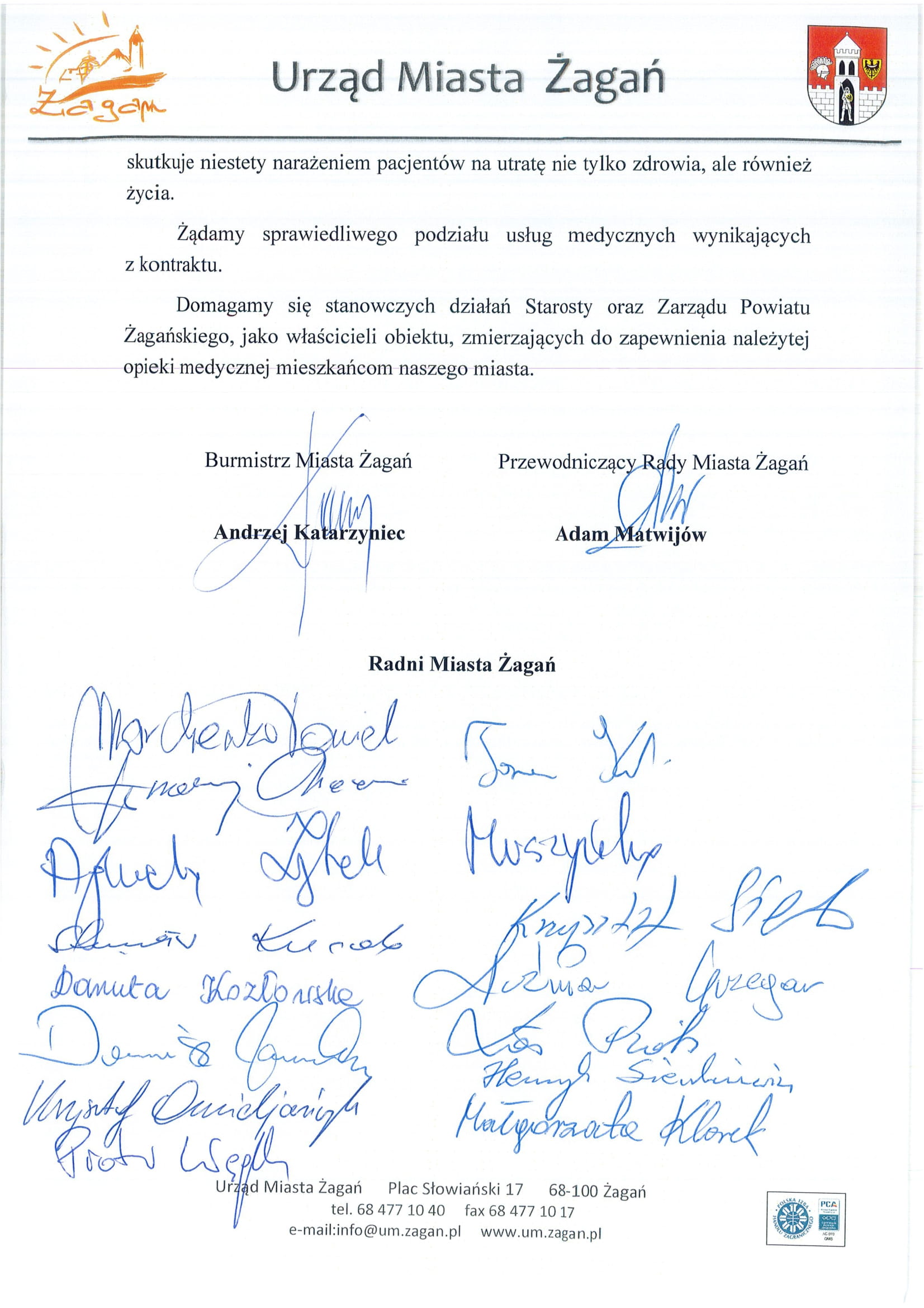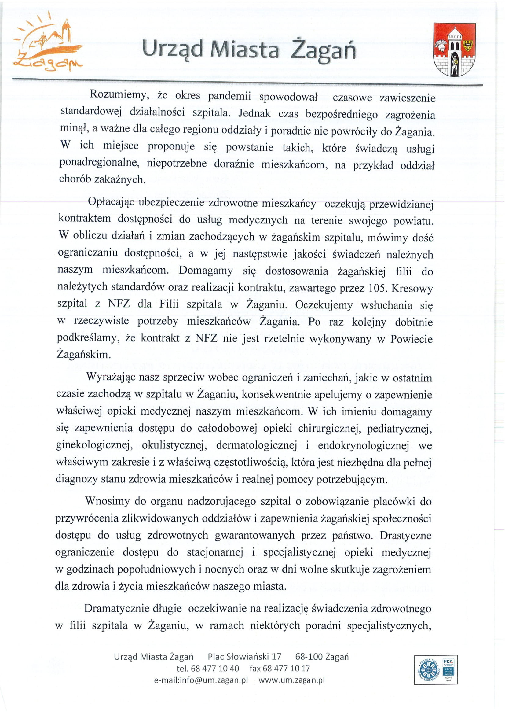 Burmistrz Andrzej Katarzyniec przed rozpoczęciem XLIX sesji Rady Miasta Żagań przedstawił stanowisko władz miasta w sprawie zabezpieczenia świadczeń zdrowotnych w żagańskiej filii 105. Kresowego Szpitala Wojskowego z Przychodnią. Gospodarz Żagania podkreślił, że obecna interwencja u organów nadzorujących żagański szpital wynika bezpośrednio z pogarszającego się stanu opieki medycznej w całym powiecie i nieprzestrzegania przez placówkę kontraktu z Narodowym Funduszem Zdrowia. Burmistrz Andrzej Katarzyniec wezwał władze powiatu, będące właścicielami budynku szpitala, do podjęcia stanowczych działań zmierzających do zapewnienia należytej opieki medycznej mieszkańcom naszego miasta oraz wyraził sprzeciw wobec marginalizowania potrzeb pacjentów z powiatu żagańskiego. Stanowisko, w którym władze miasta wnoszą o przywrócenie zlikwidowanych oddziałów i zapewnienie mieszkańcom dostępu do gwarantowanych kontraktem usług zdrowotnych, zaadresowano również do Wojewody Lubuskiego Władysława Dajczaka oraz Dyrektor Lubuskiego Oddziału Wojewódzkiego NFZ Ewy Skrbeńskiej.
