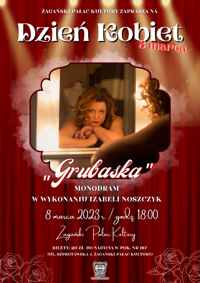Żagański Pałac Kultury z okazji Dnia Kobiet zaprasza 8 marca o godzinie 18.00 na monodram “Grubaska” w wykonaniu Izabeli Noszczyk.