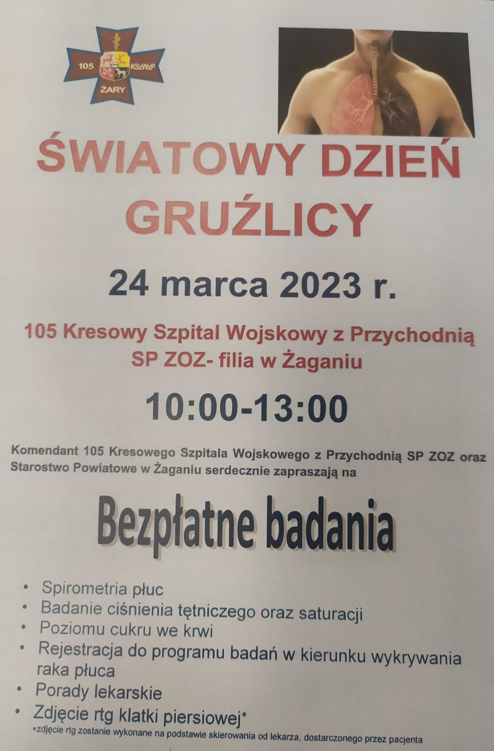 105. Kresowy Szpital Wojskowy z Przychodnią SPZOZ w Żarach został wybrany na realizatora zadania Narodowej Strategii Onkologicznej pn. ,,Program badań w kierunku wykrywania raka płuca” – na lata 2022-2023. Celem zadania jest zwiększenie wykrywalności nowotworu płuc we wczesnych stadiach jego zaawansowania, poprzez przeprowadzanie badań niskodawkowej tomografii komputerowej wśród populacji objętej programem. 24 marca placówka zaprasza na badania w związku ze Światowym Dniem Gruźlicy.