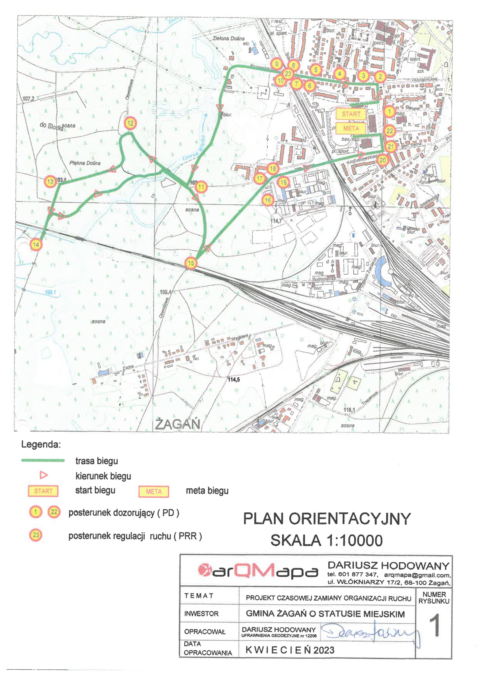 Informuję, że w dniu 29 kwietnia 2023 r. w godz. od 9.00 do 14.30 zostanie wprowadzona czasowa zmiana organizacji ruchu w ciągu dróg gminnych – ulice: M. Konopnickiej, E. Plater, Gen. Bema, i w ciągu dróg powiatowych – ulice: Kochanowskiego (4507F) i Obwodowej (4514F) w Żaganiu w celu zabezpieczenia trasy „Biegu po zdrowie dla Nikosia” poprzez czasowe całkowite zamknięcie ulic.
