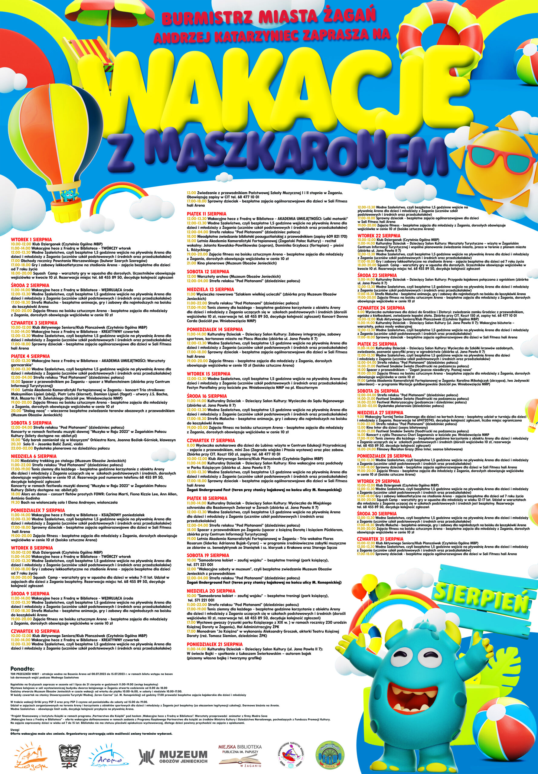 Kolejne dni wakacji zebraliśmy w jednym miejscu, tworząc kalendarz imprez zaplanowanych na lipiec i sierpień. W formie ulotki i plakatów trafił on już do szkół, instytucji kultury, Centrum Informacji Turystycznej czy punktu informacji magistratu. W trakcie wakacji codziennie będziemy informować o planowanych na dany dzień wydarzeniach na Lubię Żagań oraz na naszej stronie w kalendarium. Zapraszamy do śledzenia naszej oferty i aktywnego korzystania z przygotowanych na ten czas wydarzeń. Do zobaczenia w trakcie Wakacji z maszkaronem 2023!