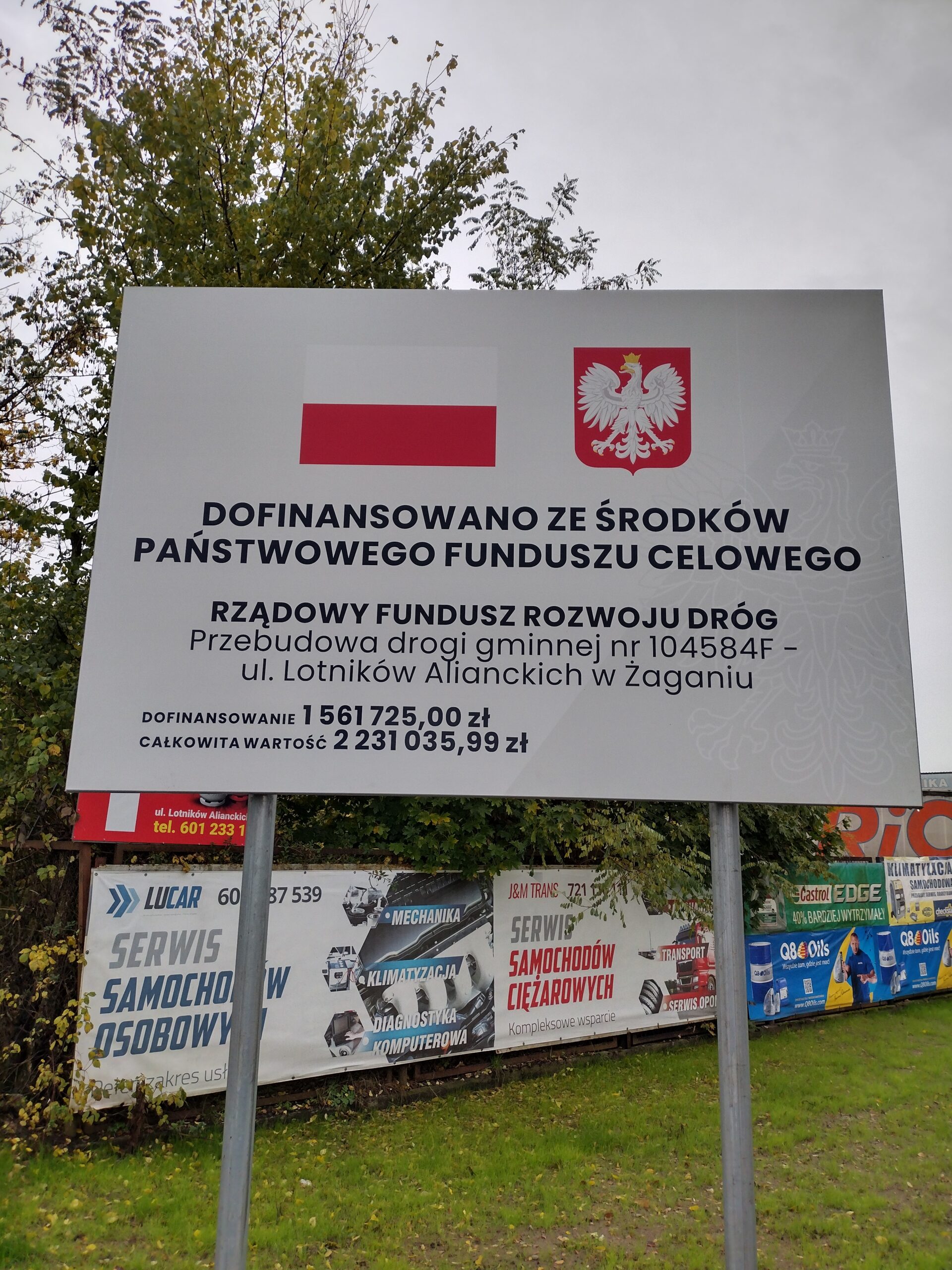 Zakończyliśmy przed planowanym terminem inwestycję przebudowy fragmentu ulicy Lotników Alianckich w Żaganiu. Powstała nowa droga, chodniki, kanalizacja deszczowa wraz z nowymi studzienkami i osadnikami. Przez wiele lat droga była w bardzo złym stanie technicznym, z licznymi ubytkami, koleinami. Nowa nawierzchnia mineralno-bitumiczna zapobiegnie powstawaniu ogromnych kałuż, które utrudniały dojazd do firm znajdujących się w regionie (również siedziby ZDW). Budżet zadania wyniósł 2 231 035,99 złotych, w tym kwota dofinansowania z Rządowego Funduszu Rozwoju Dróg 1 561 725 złotych. Kwota wkładu własnego wyniosła 669 310,99 złotych. Zgodnie z umową wykonawca miał czas do lipca 2024 roku. Zadanie udało się zakończyć do października 2023 roku.