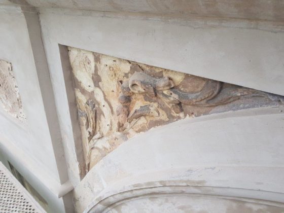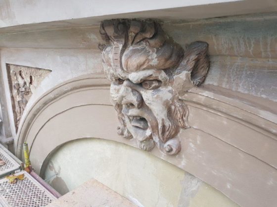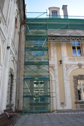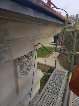 – prace remontowo-budowlane i konserwatorskie w zakresie zachowania dziedzictwa budynku Pałacu (remont kominów, opierzenia, rekonstrukcja maszkaronów, montaż rynien, rur spustowych wraz z koszami),