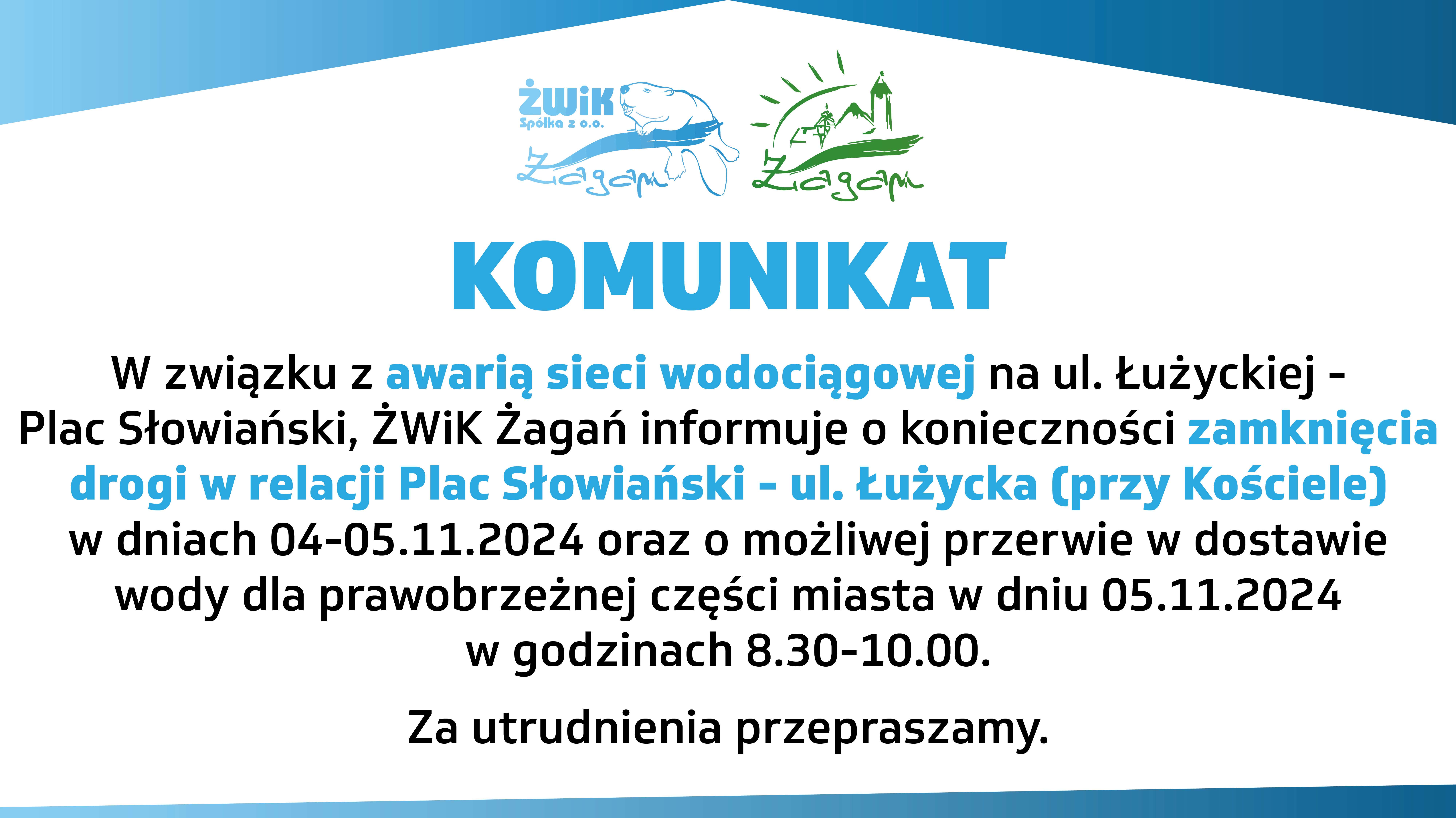 Start KOMUNIKATY Utrudnienia w dniu 5 listopada w związku z awarią wodociągową KOMUNIKATYURZĄD MIASTAWIADOMOŚCI Utrudnienia w dniu 5 listopada w związku z awarią wodociągową 2024.11.04 Zobacz równieżMEHR VOM AUTOR Żagańska Karta Mieszkańca Oświadczenie Burmistrza Miasta Żagań w sprawie oświaty Ruszył nabór wniosków do miejskiego programu wymiany kotłów na paliwa stałe