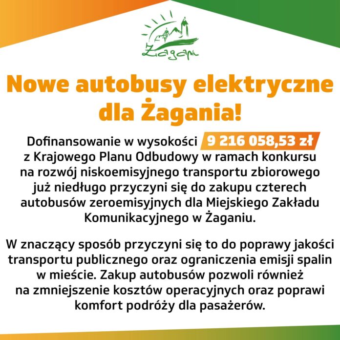 Dofinansowanie w wysokości 9 216 058,53 zł z Krajowego Planu Odbudowy w ramach konkursu na rozwój niskoemisyjnego transportu zbiorowego już niedługo umożliwi zakup czterech autobusów zeroemisyjnych dla Miejskiego Zakładu Komunikacji w Żaganiu. To ważny krok w stronę poprawy jakości transportu publicznego oraz ograniczenia emisji spalin w naszym mieście.