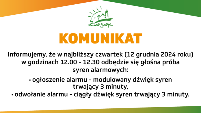Informujemy, że w najbliższy czwartek (12 grudnia 2024 roku) w godzinach 12.00 – 12.30 odbędzie się głośna próba syren alarmowych: