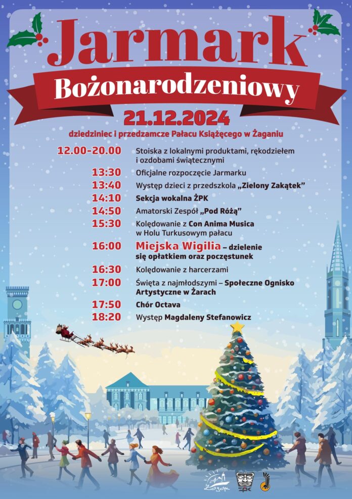 W najbliższą sobotę zapraszamy na żagański jarmark bożonarodzeniowy. Przyjdź i poczuj magię świąt, odkrywając świąteczne stragany pełne wyjątkowych prezentów, rękodzieła, smakołyków oraz bożonarodzeniowych dekoracji.