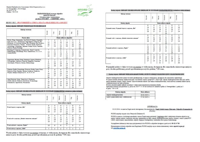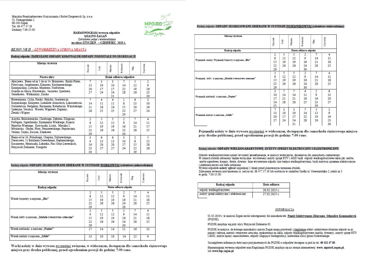 Na stronie Urzędu Miasta Żagań w zakładce “Harmonogram odbioru odpadów” opublikowane zostały harmonogramy odbioru odpadów dla prawobrzeżnej i lewobrzeżnej części miasta na okres od stycznia do końca czerwca 2025 roku.