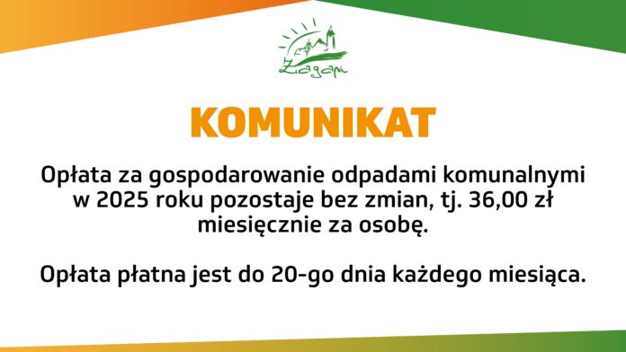 Opłata za gospodarowanie odpadami komunalnymi w 2025 roku pozostaje bez zmian, tj. 36,00 zł miesięcznie za osobę. Opłata płatna jest do 20-go dnia każdego miesiąca.