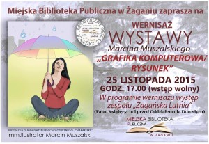 Miejska Biblioteka Publiczna w Żaganiu zaprasza na wernisaż wystawy rysunku i grafiki komputerowej Marcina Muszalskiego, która 25 listopada 2015 roku o godzinie 17.00 zainaugurowana zostanie w holu Pałacu Książęcego przed Oddziałem dla Dorosłych. W ramach inauguracji wystawy zapraszamy na występ zespołu Żagańska Lutnia.