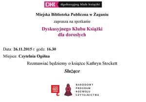 Miejska Biblioteka Publiczna zaprasza na spotkanie Dyskusyjnego Klubu Książki w Czytelni Ogólnej Pałacu Książęcego. 26 listopada 2015 roku o godzinie 16.30 rozpocznie się rozmowa o książce Kathryn Stockett pod tytułem"Służące".