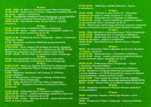 16 lipca (wtorek) w pałacyku przy ul. Jana Pawła II 7 o godzinie 10.00 odbędą się warsztaty plastyczne dla dzieci w wieku szkolnym (7-12 lat) przygotowane przez Centrum Kultury. Od 12.00 do 13.30 skorzystać można z “wodnego szaleństwa”, czyli bezpłatnego wejścia na basen dla dzieci i młodzież do lat 16. Od godziny 11.00 zapraszamy na […]