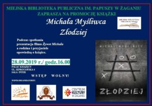 Miejska Biblioteka Publiczna im. Papuszy w Żaganiu zaprasza 28 września (sobota) na godzinę 16.00 do sali Inter Pałacu Książęcego na promocję książki Michała Myśliwca "Złodziej" (wstęp wolny). Podczas spotkania będzie miała miejsce prezentacja filmu "Żywot Michała", a rodzina i przyjaciele opowiedzą o książce.