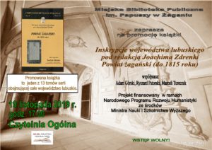 Biblioteka zaprasza we wtorek, 19 listopada 2019 r. o godz. 17.00 do Czytelni Ogólnej (Pałac Książęcy) na promocję książki "Inskrypcje województwa lubuskiego" pod redakcją Joachima Zdrenki. Powiat żagański (do 1815 roku).
