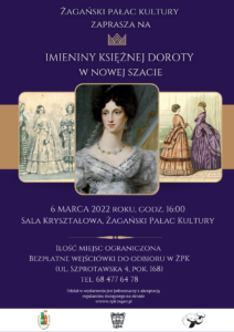 Zapraszamy na ,,Imieniny Księżnej Doroty w Nowej Szacie". Imieniny wypadają 6 lutego, jednak z uwagi na pandemiczne ograniczenia, postanowiliśmy przełożyć je o miesiąc. 6 marca o godz. 16:00 zapraszamy do sali Kryształowej Żagańskiego Pałacu Kultury na to wyjątkowe wydarzenie. Bezpłatne wejściówki do odbioru w ŻPK (ul. Szprotawska 4, pok. 168).