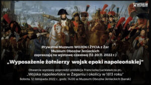Prywatne Muzeum WOJEN I ŻYCIA z Żar i Muzeum Obozów Jenieckich zapraszają na wystawę czasową (12-20.11. 2022 r.) „Wyposażenie żołnierzy wojsk epoki napoleońskiej”. Otwarcie wystawy poprzedzi prelekcja Franciszka Łuckiewicza „Wojska napoleońskie w Żaganiu i okolicy w 1813 roku”. Sobota, 12 listopada 2022 r., godz. 14:00 w Muzeum Obozów Jenieckich (barak)