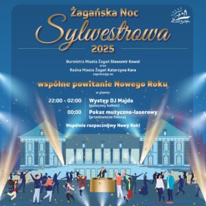 Burmistrz Sławomir Kowal oraz Przewodnicząca Rady Miasta Żagań Katarzyna Kara zapraszają wszystkich mieszkańców w Noc Sylwestrową przed Pałac Książęcy na wspólne powitanie Nowego Roku. Od 22:00 do 2:00, specjalnie dla Państwa z pałacowego balkonu zagra DJ Majda. O północy rozpoczniemy pokaz muzyczno-laserowy. Bądźmy razem!