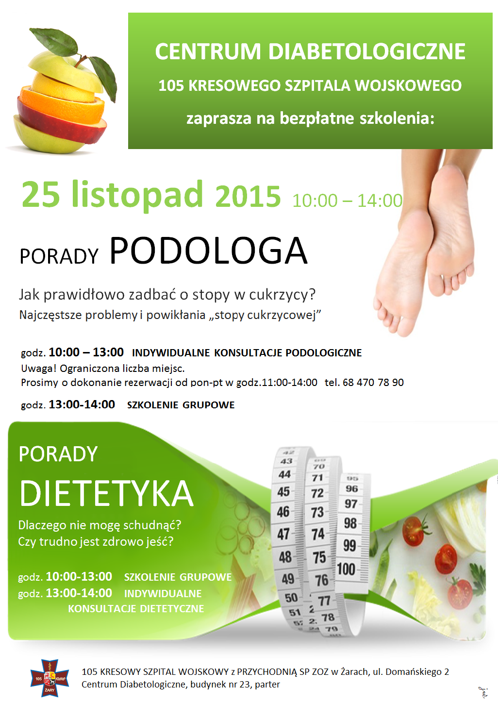 Centrum Diabetologiczne 105. Kresowego Szpitala Wojskowego w Żarach zaprasza na bezpłatne szkolenia: