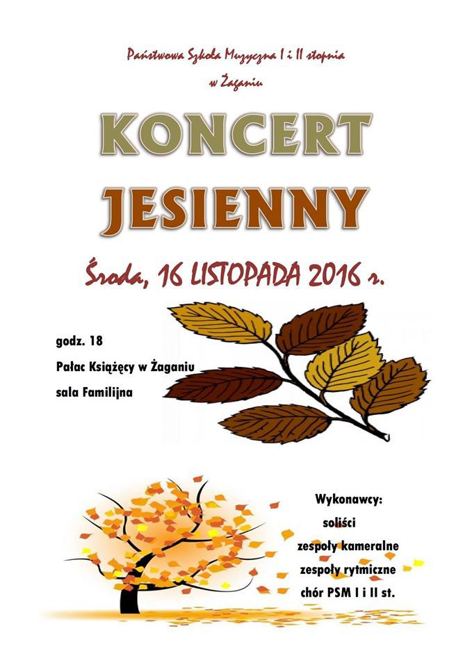16 listopada (środa) o godz. 18:00 w Sali Familijnej Pałacu Książęcego odbędzie się Koncert jesienny. W koncercie wezmą udział: soliści, zespół rytmiczny, zespoły kameralne oraz chór PSM I i II stopnia. Serdecznie zapraszamy!