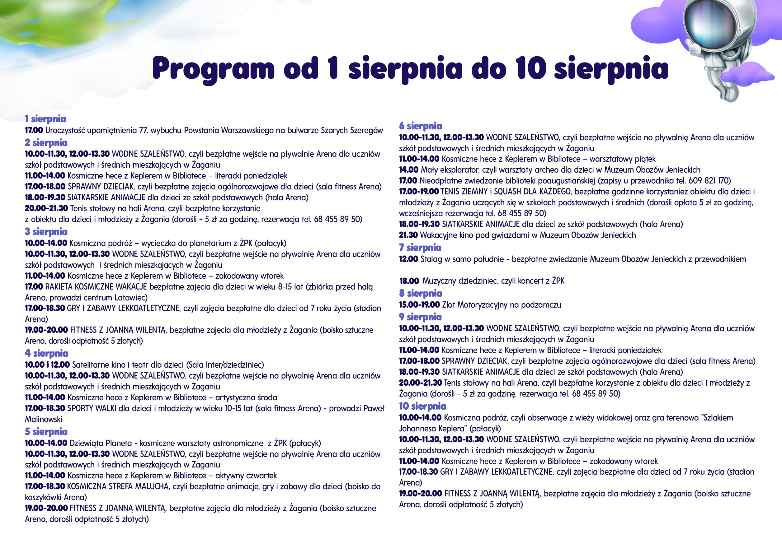 Oferta spółki Arena jest bezpłatna dla dzieci i młodzieży z Żagania uczących się w szkołach podstawowych i średnich za okazaniem legitymacji szkolnej. Dorośli mogą korzystać z popołudniowych zajęć za opłatą (ulgową). Ilość osób uczestniczących w zajęciach dostosowana zostanie do obowiązujących wymogów sanitarnych.
