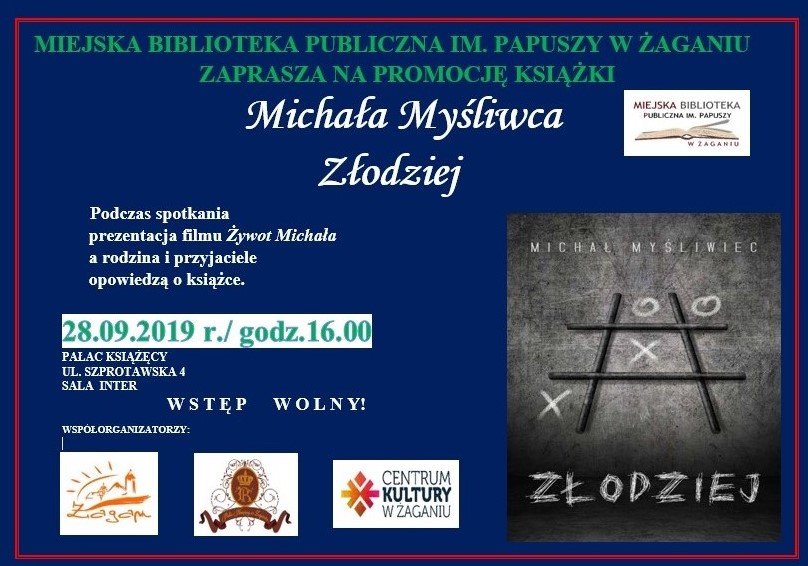 Miejska Biblioteka Publiczna im. Papuszy w Żaganiu zaprasza 28 września (sobota) na godzinę 16.00 do sali Inter Pałacu Książęcego na promocję książki Michała Myśliwca “Złodziej” (wstęp wolny). Podczas spotkania będzie miała miejsce prezentacja filmu “Żywot Michała”, a rodzina i przyjaciele opowiedzą o książce.