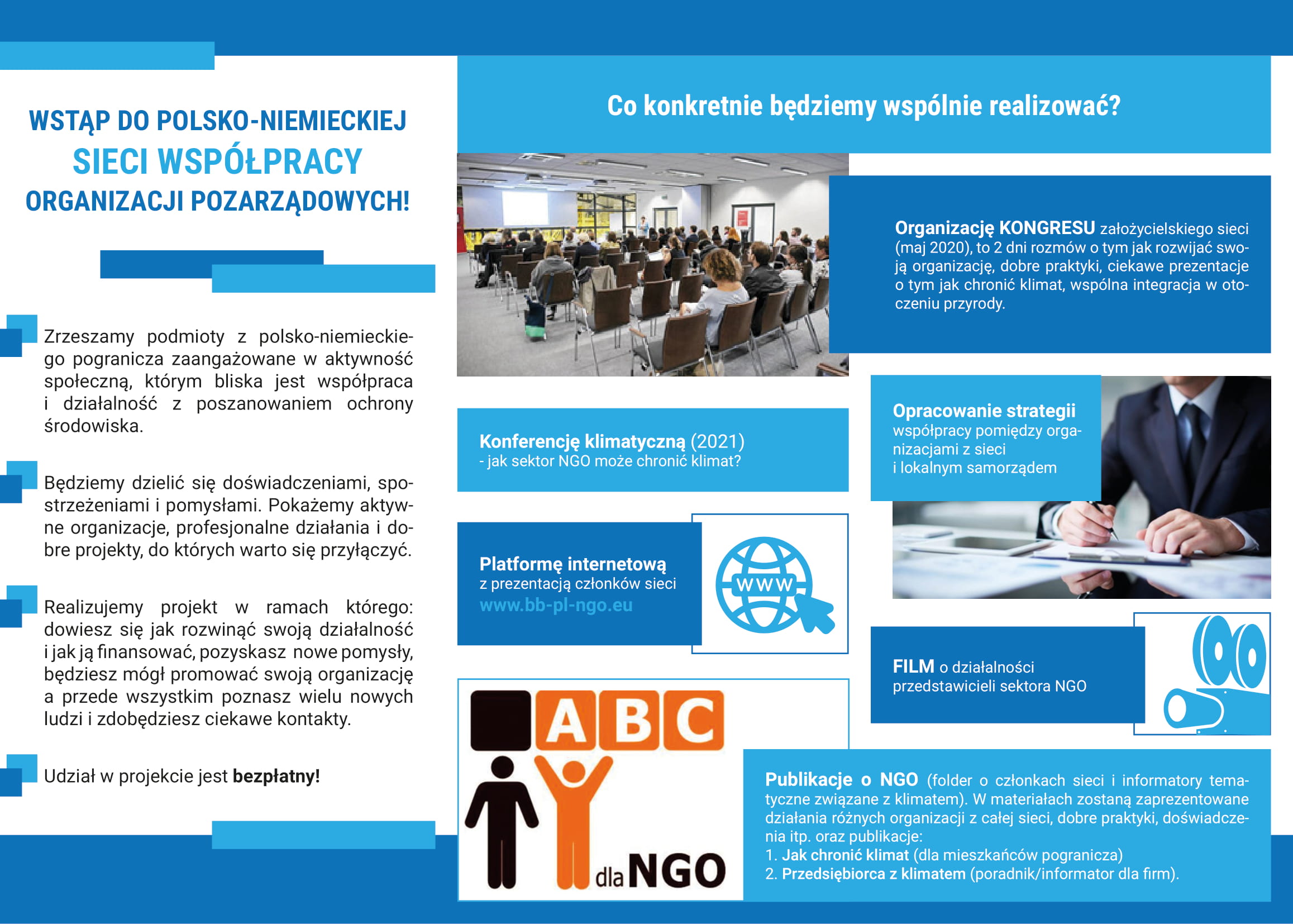 W ramach projektu pn. „Sieć współpracy organizacji pozarządowych pogranicza polsko-niemieckiego na rzecz ochrony klimatu” zostanie zrealizowanych wiele bezpłatnych działań na rzecz współpracy organizacji pozarządowych pogranicza polsko-niemieckiego w tym m.in.: transgraniczne targi-piknik NGO, publikacje dla członków sieci, szlaki edukacyjne i murale o ochronie klimatu, mikroadaptacje klimatyczne, kalendarz imprez i wydarzeń pogranicza, wystawy plenerowe i film o działalności sektora NGO i ochronie klimatu, warsztaty tematyczne z wyjazdami studyjnymi oraz publikacje dla mieszkańców i przedsiębiorców pogranicza jak można chronić klimat.