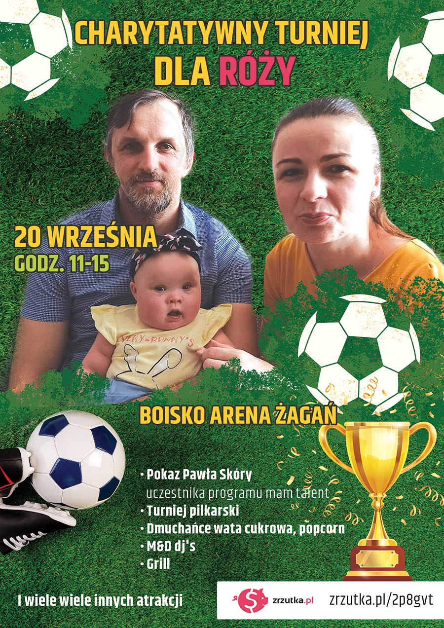 20 września w godzinach 11.00-15.00 zapraszamy na żagańską Arenę, gdzie odbędzie się charytatywny turniej dla Róży Merza. Wśród atrakcji m.in. pokaz Pawła Skóry – uczestnika programu “Mam talent”, turniej piłkarski, dmuchańce, wata cukrowa, popcorn, M&D dj’s oraz grill.