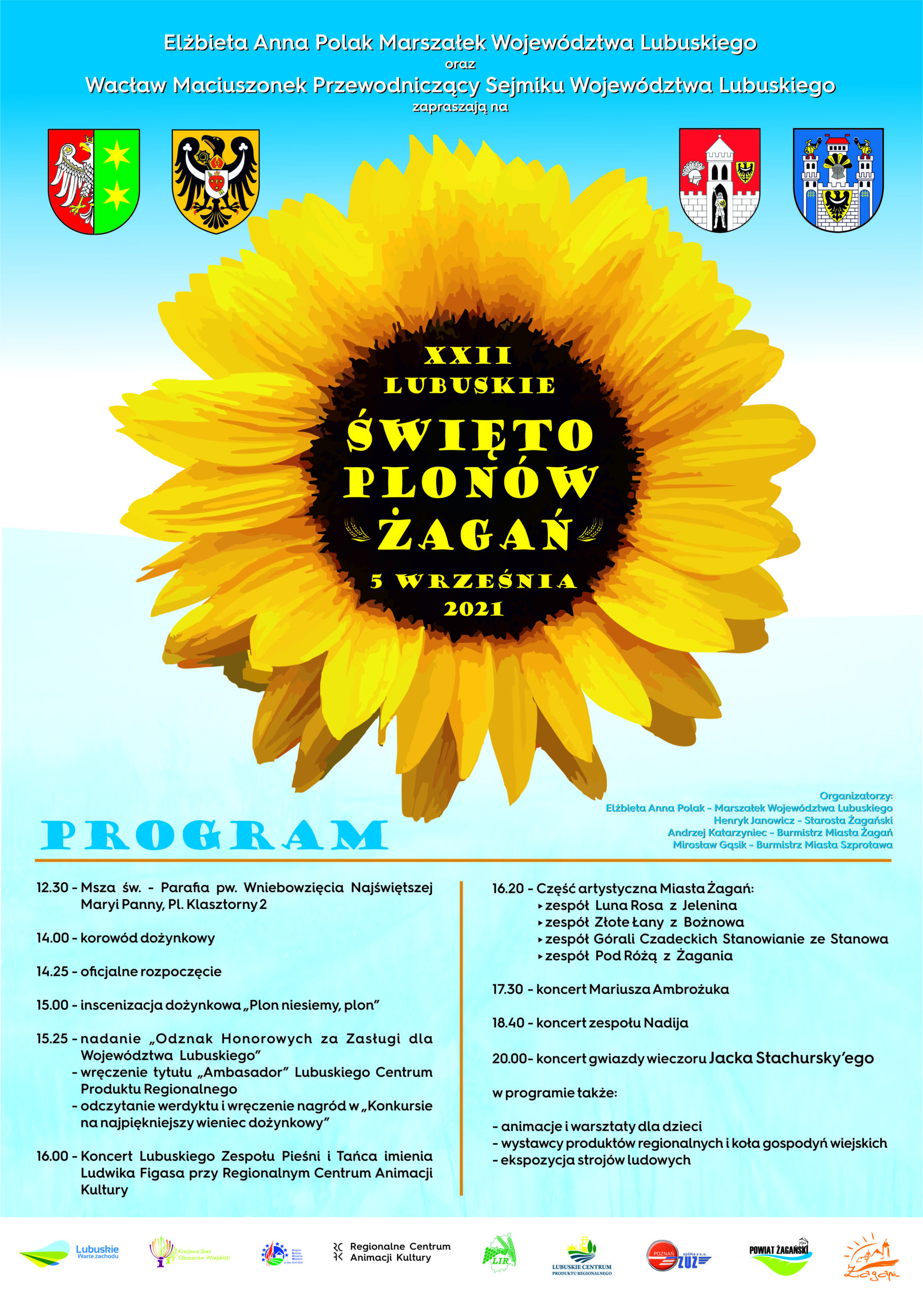 Na podzamczu na lubuszan będą czekały stoiska wystawców produktów regionalnych i koła gospodyń wiejskich, animacje dla dzieci prowadzone przez Regionalne Centrum Animacji Kultury oraz wystawa strojów ludowych. W trakcie imprezy ogłoszone zostaną wyniki konkursu na najpiękniejszy wieniec dożynkowy. Na scenie wystąpią lokalne zespoły: Luna Rosa, Złote Łany, Górale Czadeccy Stanowianie i Pod Różą. Będzie można również wysłuchać koncertu Mariusza Ambrożuka i zespołu Nadija, a o 20.00 przewidziany jest koncert gwiazdy wieczoru: Jacka Stachursky’ego.