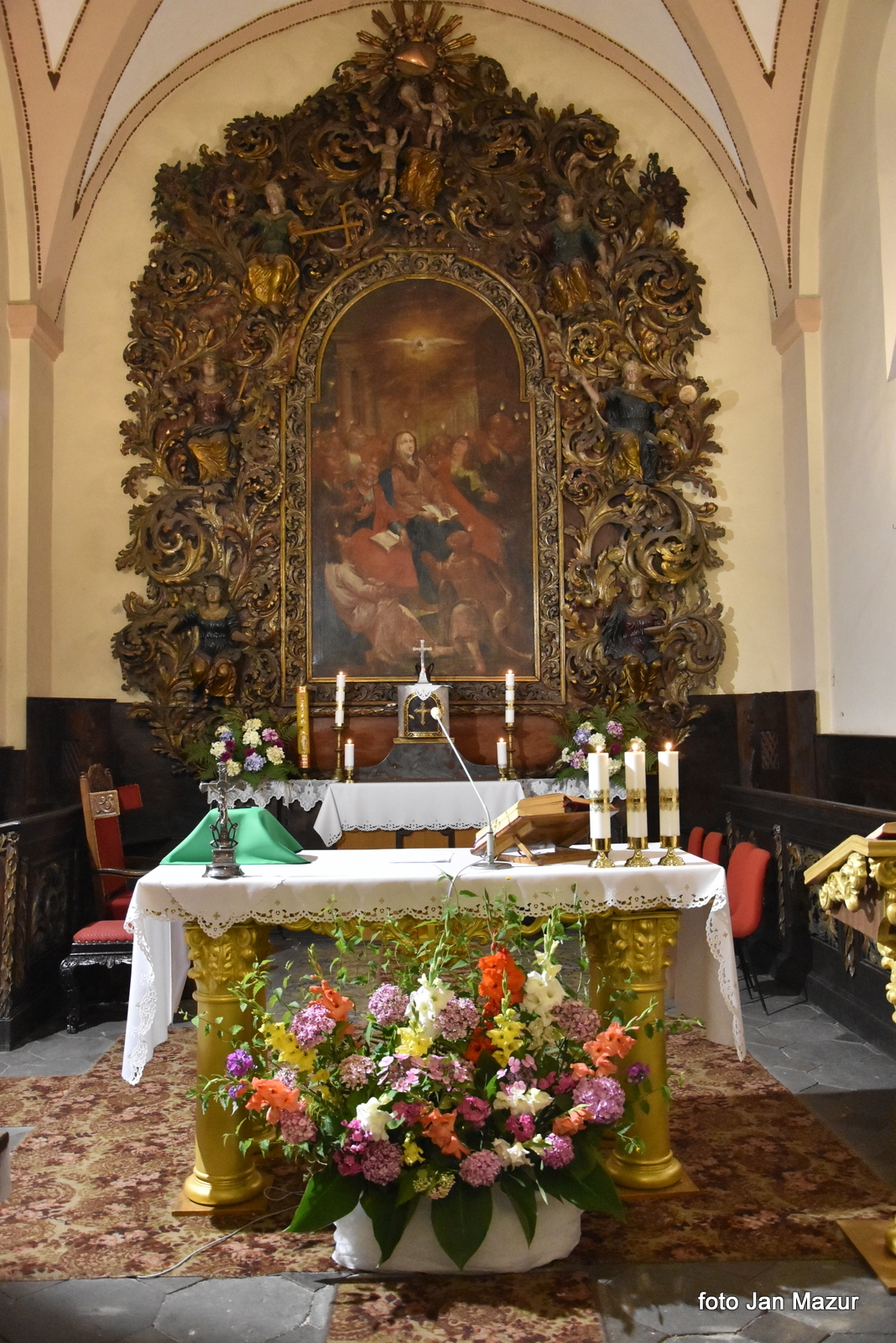 Die Heilig-Geist-Kirche ist mit dem Gebäude des ehemaligen Krankenhauses durch den Torbogen mit der Statue des heiligen Antonius verbunden. Der Haupteingang ist mit Pflanzenmotiven und Putti verziert. An der Stirnwand des Gebäudes befinden sich barocke Figuren, die drei theologische Tugenden repräsentieren: Glaube, Hoffnung und Liebe.