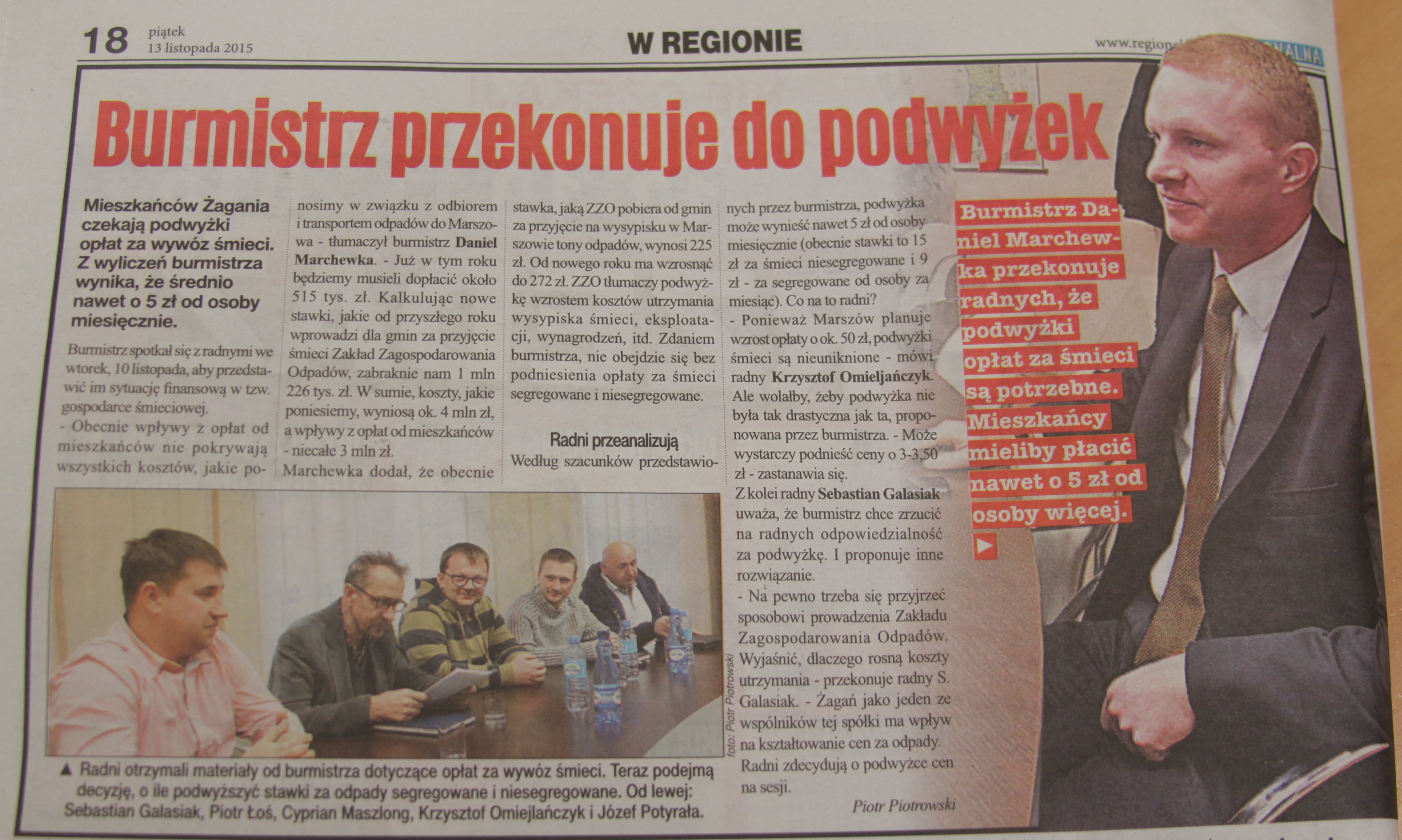Odnosząc się do artykułu Piotra Piotrowskiego pod tytułem “Burmistrz przekonuje do podwyżek”, zamieszczonego w 46 (760) numerze gazety “Regionalnej” z 13 listopada 2015 roku informujemy, że na spotkaniu z radnymi, które miało miejsce 10 listopada burmistrz Daniel Marchewka przedstawił informacje na temat dochodów i wydatków w ramach systemu gospodarowania odpadami komunalnymi w mieście. Sugerowana w artykule kwota 5 złotych nie była proponowaną kwotą podwyżki, lecz kwotą, jakiej miesięcznie zabraknie, aby całkowicie zbilansować przyszłoroczne wydatki ponoszone przez Gminę Żagań o statusie miejskim w związku z gospodarką odpadami. Na spotkaniu nie padła żadna sugestia burmistrza dotycząca kwoty ewentualnych podwyżek. Daniel Marchewka poinformował radnych o szacunkowych kosztach przyszłorocznych dopłat ze środków własnych gminy, prosząc o zgłaszanie propozycji stawek opłat za gospodarowanie odpadami komunalnymi w celu wypracowania wspólnego stanowiska w obliczu przedstawionej sytuacji.