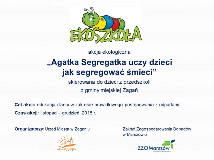 Do akcji zgłosiło się sześć żagańskich placówek. Celem akcji jest zachęcenie dzieci do prawidłowej segregacji odpadów. W jej ramach specjalista ds. edukacji ZZO Marszów prowadzi lekcje ekologiczne w przedszkolach. Podczas zajęć dzieci poznają bohaterkę akcji, maskotkę Zakładu Zagospodarowania Odpadów w Marszowie – Agatkę Segregatkę, która pomaga dzieciom zapamiętać kolory segregacji. Dzieci uczą się zasad prawidłowej segregacji odpadów, odpowiadają na pytania – dlaczego warto segregować odpady, co można otrzymać z odpadów? Do końca grudnia w zajęciach weźmie udział ponad 500 dzieci. Urząd Miasta w Żaganiu przygotował upominki dla placówek i dzieci uczestniczących w akcji edukacyjnej – każdy maluch otrzyma kamizelkę odblaskową, natomiast przedszkole zgniatarkę do plastikowych butelek.