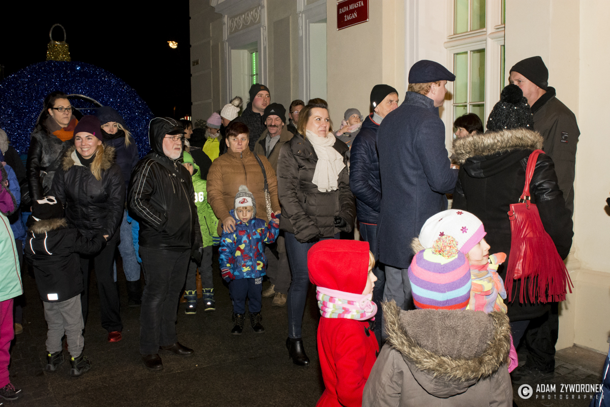 6 grudnia 2016 roku burmistrz Daniel Marchewka zaprosił mieszkańców miasta na Plac Słowiański, gdzie o godzinie 18:00 uruchomiono największe elementy iluminacji świątecznej. Wspólne odliczanie zakończyło się włączeniem ogromnej choinki oraz świątecznej bombki, która wzbudziła największe zainteresowanie najmłodszych uczestników spotkania. Takiej bombki jeszcze w Żaganiu nie było! Wśród zebranych na Placu Słowiańskim przechadzały się również uśmiechnięte śnieżynki, asystentki Świętego Mikołaja, rozdające zebranym słodkie upominki.