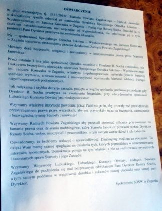 Cała treść oświadczenia społeczności SOSW w Żaganiu poniżej.
