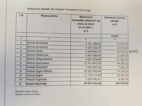 Chodzi o wstępne wyliczenia wpłat do związku, wyliczonych między innymi na podstawie dochodów i potrzeb transportowych poszczególnych udziałowców. – Na podstawie statutu łatwo można policzyć, że na przykład gmina Szprotawa będzie musiała zapłacić ok. 95 tys. zł, miasto Żagań 75 tys. zł, gmina Brzeźnica 11 tys. zł, zaś powiat żagański 6 tys. zł – wyjaśnił Z. Białkowski. To zrozumiałe, że największe gminy będą ponosiły największe koszty, ale wobec tego ich głos powinien być liczony proporcjonalnie do udziałów.