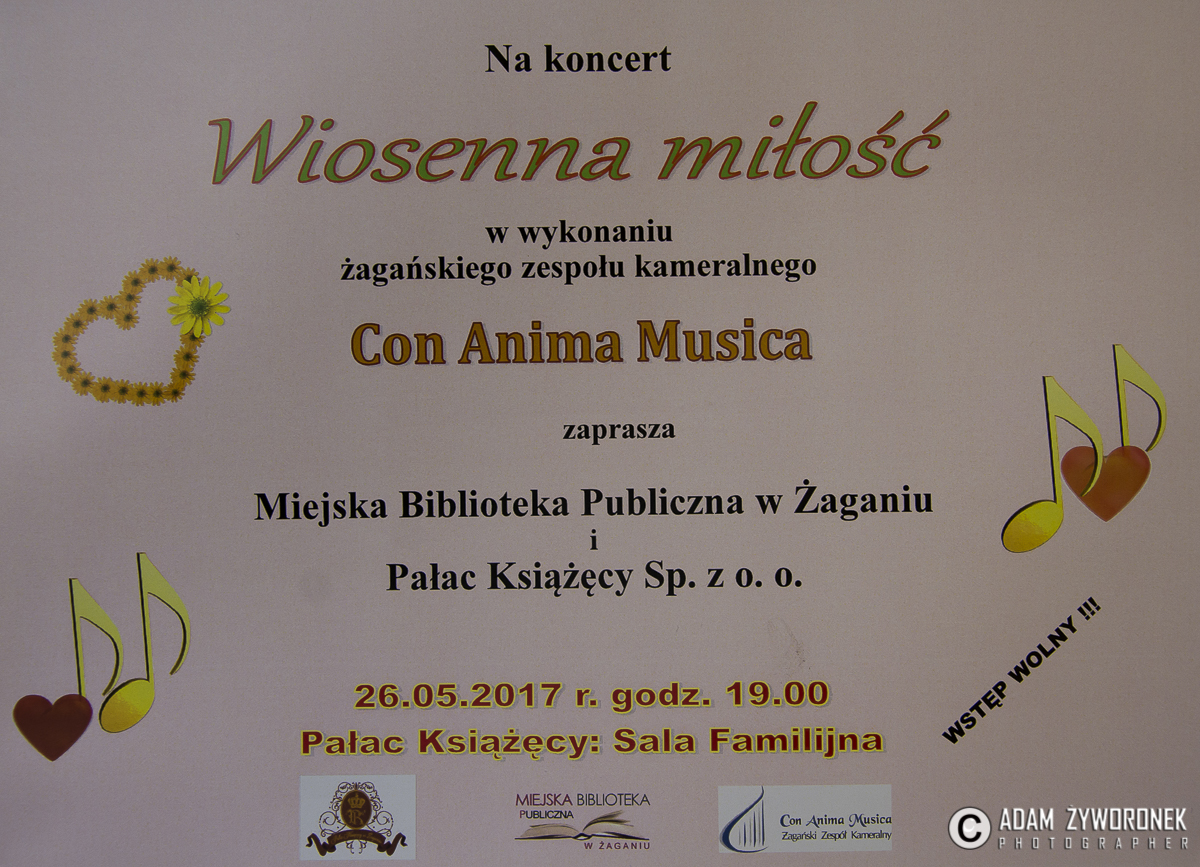 26.05.2017 r w sali Pałacu Książęcego w Żaganiu miał miejsce koncert Czas na wiosenną miłość w wykonaniu żagańskiego zespołu kameralnego Con Anima Musica.W koncercie wzieli udział uczestnicy delegacji z zaprzyjaźnionego miasta partnerskiego Saint-Omer we Francji, z burmistrzem Fracois Decoster i jego zastępcą.