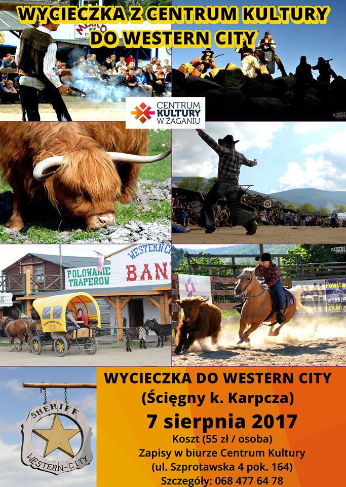 Centrum Kultury przygotowało ciekawą ofertę dla dzieci spędzających wakacje w mieście. Chętnych do wyjazdu po przygodę zapraszamy 7 sierpnia na wycieczkę do kowbojskiego miasteczka Western City. Do wyprawy w czasie na amerykański Dziki Zachód, na spotkanie z szeryfem zapraszamy dzieci w wieku szkolnym (7 – 12 lat).