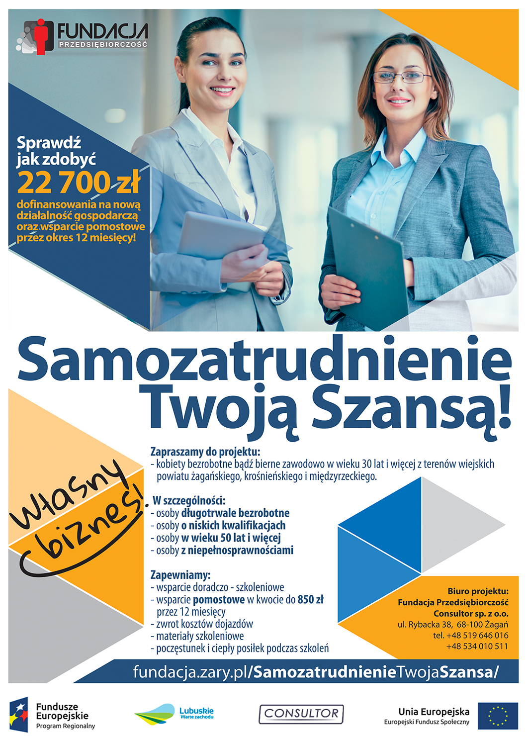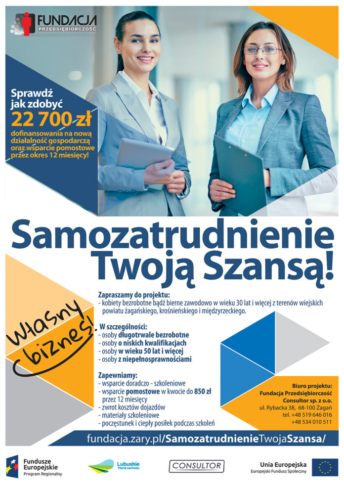 Fundacja “Przedsiębiorczość” zaprasza kobiety bezrobotne bądź bierne zawodowo do udziału w projekcie „Samozatrudnienie Twoją Szansą”. Projekt zakłada przygotowanie 30 Uczestników do rozpoczęcia i prowadzenia działalności gospodarczej poprzez udział w szkoleniach, doradztwie oraz udzielenie dotacji i/lub wsparcia pomostowego dla 20 z nich. Projekt realizowany jest na terenie powiatów żagańskiego, międzyrzeckiego, krośnieńskiego. W ramach projektu oferujemy bezzwrotne dotacje dla kobiet na rozpoczęcie działalności gospodarczej w wysokości 22 700 76 zł oraz wsparcie pomostowe przez okres 12 miesięcy w wysokości 851,24 zł/m-c. Ponadto doradztwo zawodowe, biznesowe, szkolenia w zakresie zakładania działalności gospodarczej.