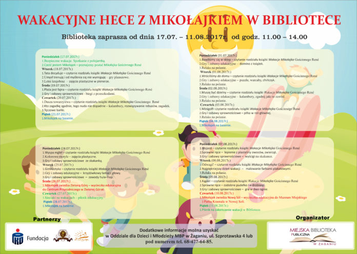 W tym roku dzieci uczestniczące w zajęciach przygotowanych przez Miejską Bibliotekę Publiczną bawią się z Mikołajkiem, postacią stworzoną przez René Gościnnego na zajęciach pod hasłem WAKACYJNE HECE Z MIKOŁAJKIEM W BIBLIOTECE. Dzieci czytają fragmenty książki, bawią się jak Mikołajek: malują, grają w gry planszowe i piłkę, spacerują, biorą udział w zawodach sprawnościowych, pływają na basenie miejskim.