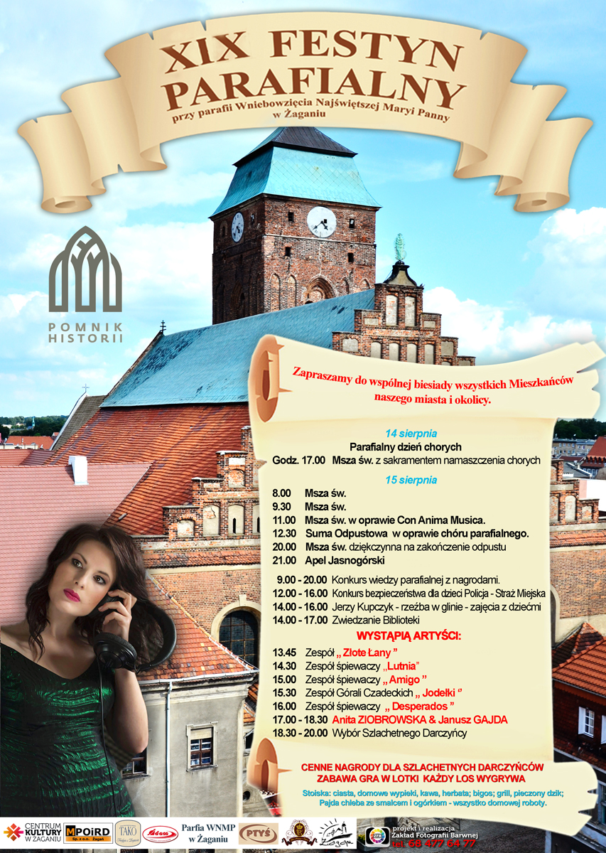 We wtorek 15 sierpnia parafia pod wezwaniem Wniebowzięcia Najświętszej Marii Panny przy pl. Klasztornym wraz z Centrum Kultury w Żaganiu zapraszają na XIX edycję Festynu Parafialnego.