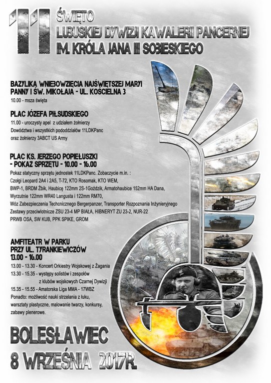 W piątek 8 września uroczystości będą się odbywać w Bolesławcu. Wezmą w nich udział m.in. amerykańscy żołnierze Pancernej Brygadowej Grupy Bojowej (ABCT). 10.00 – 11.00 msza św. W Bazylice Wniebowzięcia Najświętszej Maryi Panny i św. Mikołaja przy ul. Kościelnej 3. 11.00 – 12.00 plac Józefa Piłsudskiego – uroczysty apel. 10.00 – 16.00 plac ks. Jerzego Popiełuszki – pokaz statyczny sprzętu jednostek 11LDKPanc. 13.00 – 16.00 amfiteatr w parku przy ul. Tyrankiewiczów – występy artystów z klubów wojskowych Czarnej Dywizji