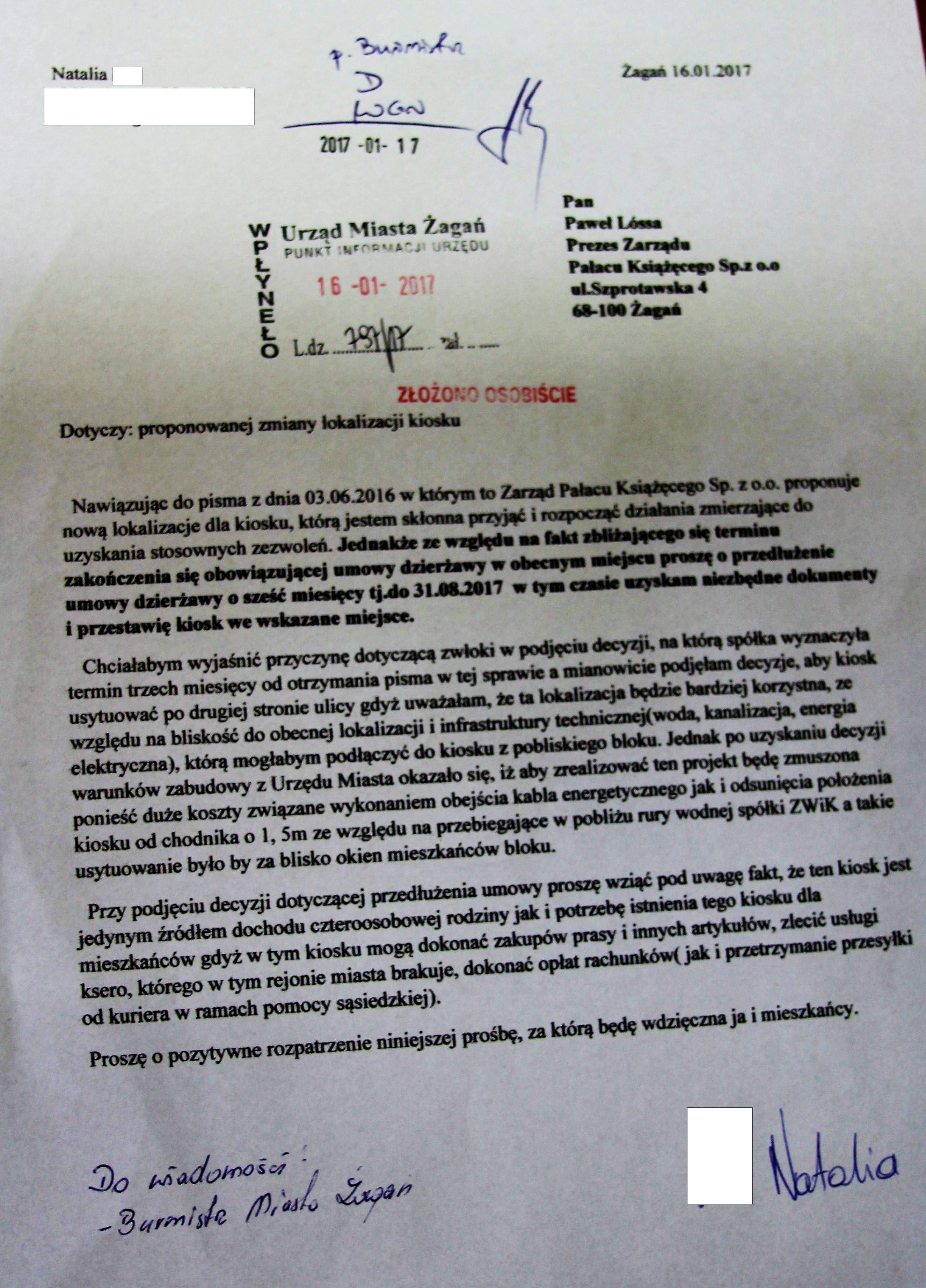 W lutym 2017 roku kończyła się umowa na dzierżawę gruntu pod kioskiem przy kompleksie Arena. W styczniu tego roku osoba formalnie prowadząca działalność gospodarczą, czyli córka radnego zwróciła się do spółki Pałac Książęcy o przedłużenie dzierżawy o 6 miesięcy, do końca sierpnia 2017 roku, jednocześnie informując, że ostatecznie przystaje na wcześniej zaproponowaną lokalizację, na skrzyżowaniu ul. Kochanowskiego i Bema, również należącą do miasta. Czas był jej potrzebny na przeniesienie obiektu. Powoływała się przy tym na interes mieszkańców, którzy mogą dokonywać w kiosku zakupów, a także wykonać kserokopię dokumentów. Podkreślała też, że kiosk jest jedynym źródłem utrzymania dla czteroosobowej rodziny.