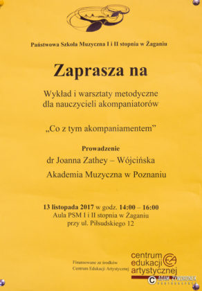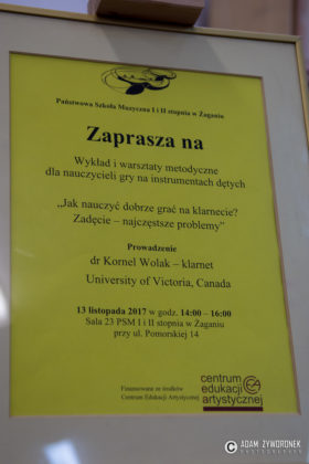 13 listopada w naszej szkole odbyły się warsztaty metodyczne dla nauczycieli – akompaniatorów oraz nauczycieli gry na instrumentach dętych. W Auli PSM przy ul. Piłsudskiego 12 spotkali się nauczyciele – akompaniatorzy w wykładzie i warsztatach metodycznych prowadzonych przez dr Joannę Zathey – Wójcińską – Akademia Muzyczna w Poznaniu.Temat spotkania: „Co z tym akompaniamentem?”. W budynku szkoły przy ul. Pomorskiej 14 – sala nr 23 spotkali się nauczyciele gry na instrumentach dętych. Pracowali oni pod kierunkiem dr Kornela Wolaka – University of Victoria, Canada. Temat spotkania: „Jak nauczyć dobrze grać na klarnecie? Zadęcie – najczęstsze problemy”. W spotkaniach metodycznych wzięli także udział nauczyciele ze szkół muzycznych naszego regionu: Nowej Soli, Szprotawy i Żar.