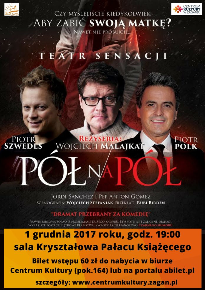 Centrum Kultury w Żaganiu zaprasza na spektakl w reżyserii Wojciecha Malajkata pt. „Pół na pół”, który odbędzie się 1 grudnia tego roku o godz. 19.00 w sali Kryształowej Pałacu Książęcego w Żaganiu.