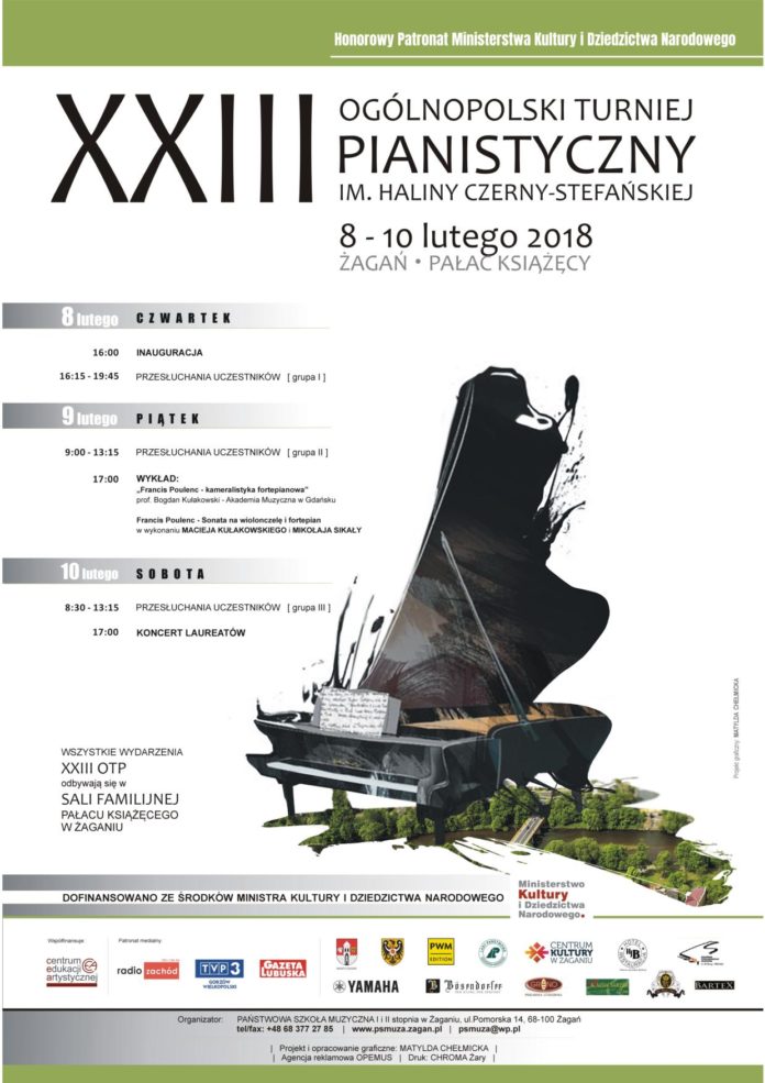 Już po raz dwudziesty trzeci w imieniu Państwowej Szkoły Muzycznej I i II stopnia w Żaganiu zapraszamy młodych adeptów sztuki gry na fortepianie z całego kraju na Ogólnopolski Turniej Pianistyczny im. Haliny Czerny-Stefańskiej. Będzie się on odbywał w dniach 8 – 10 lutego br., a miejscem wszystkich jego wydarzeń będzie Sala Familijna Żagańskiego Pałacu Książęcego. Z przyjemnością informujemy, że XXIII Ogólnopolski Turniej Pianistyczny im. Haliny Czerny – Stefańskiej został objęty honorowym patronatem Ministra Kultury i Dziedzictwa Narodowego.