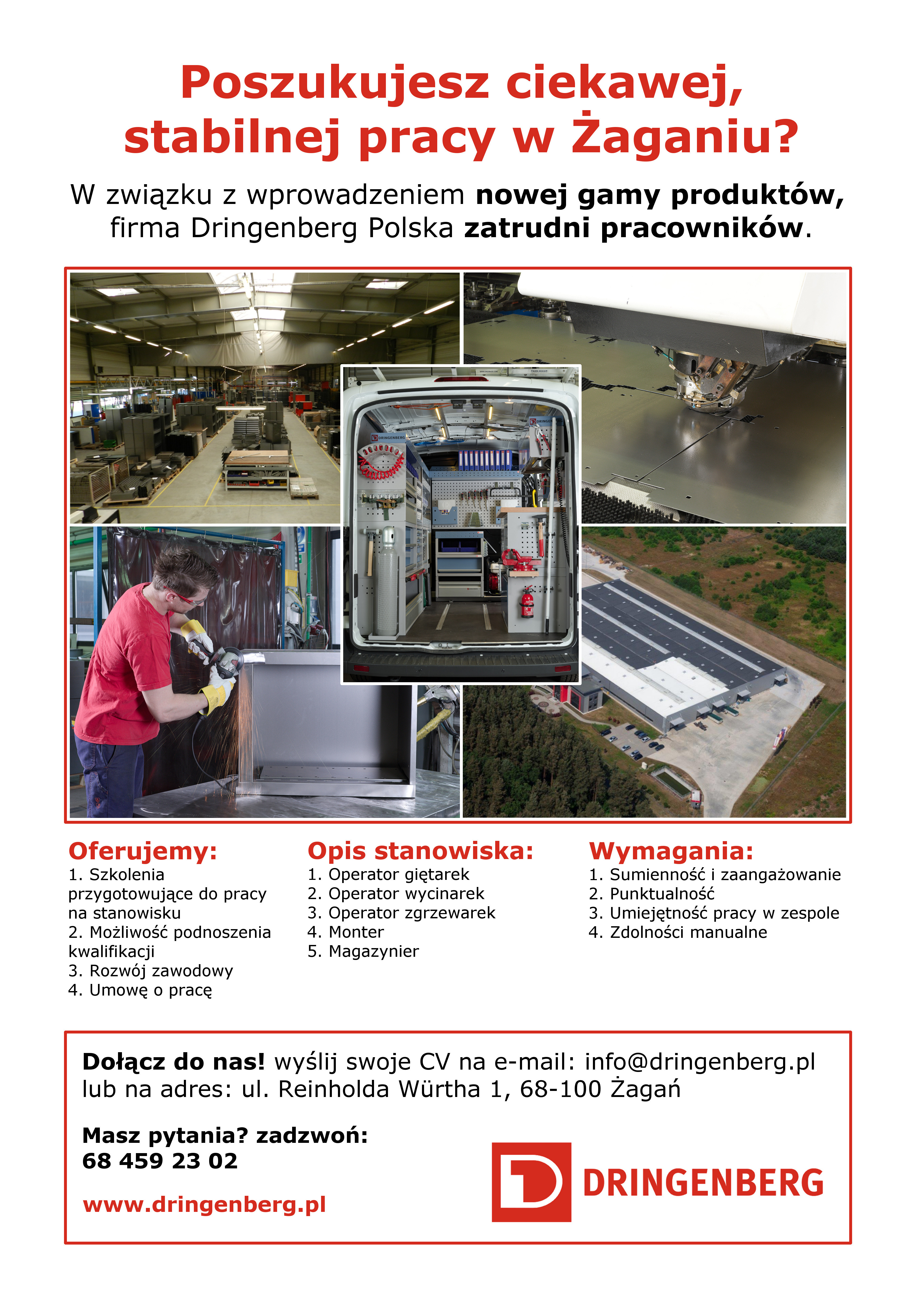 CV należy wysyłać na e-mail: info@dringenberg.pl, lub na adres ul. Reinholda Wuertha 1, 68-100 Żagań.