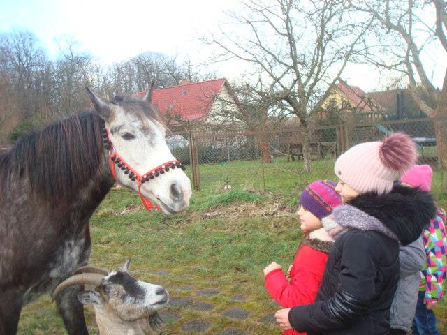 Na zdjęciu uczestnicy ferii z biblioteką na wycieczce i spotkaniu ze zwierzętami z gospodarstwa z Gryżyc.