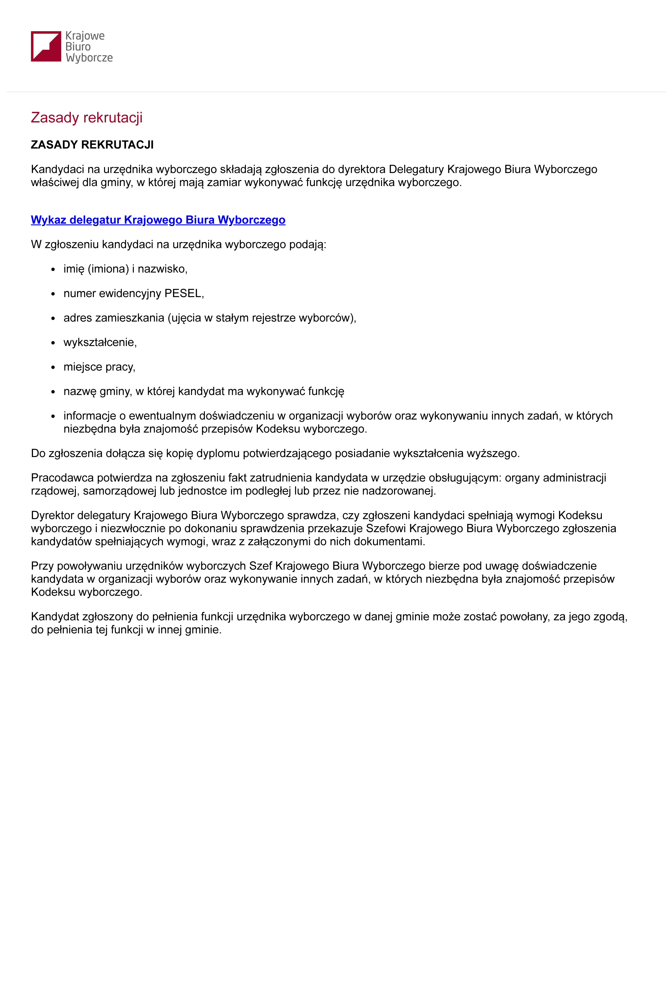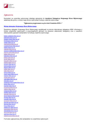 Krajowe Biuro Wyborcze, Delegatura w Zielonej Górze przedłużyło termin zgłoszeń kandydatów do pełnienia funkcji urzędników wyborczych do 6 kwietnia 2018 r.