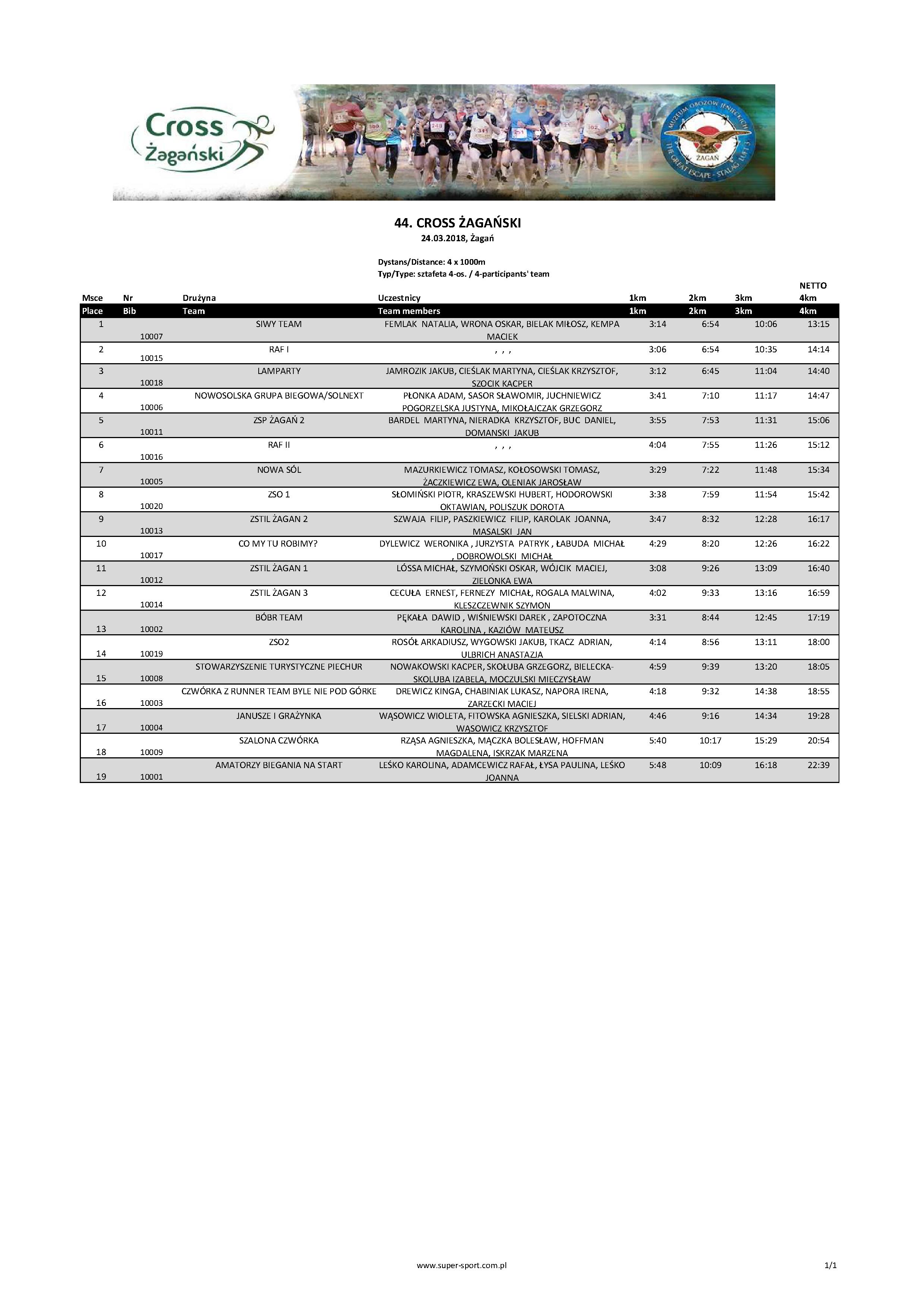 W biegu sztafetowym zwyciężyła drużyna Siwy Team z Żar. Drugie miejsce zajęła reprezentacja RAF z Anglii, trzecie Lamparty z Żar i Poznania.
